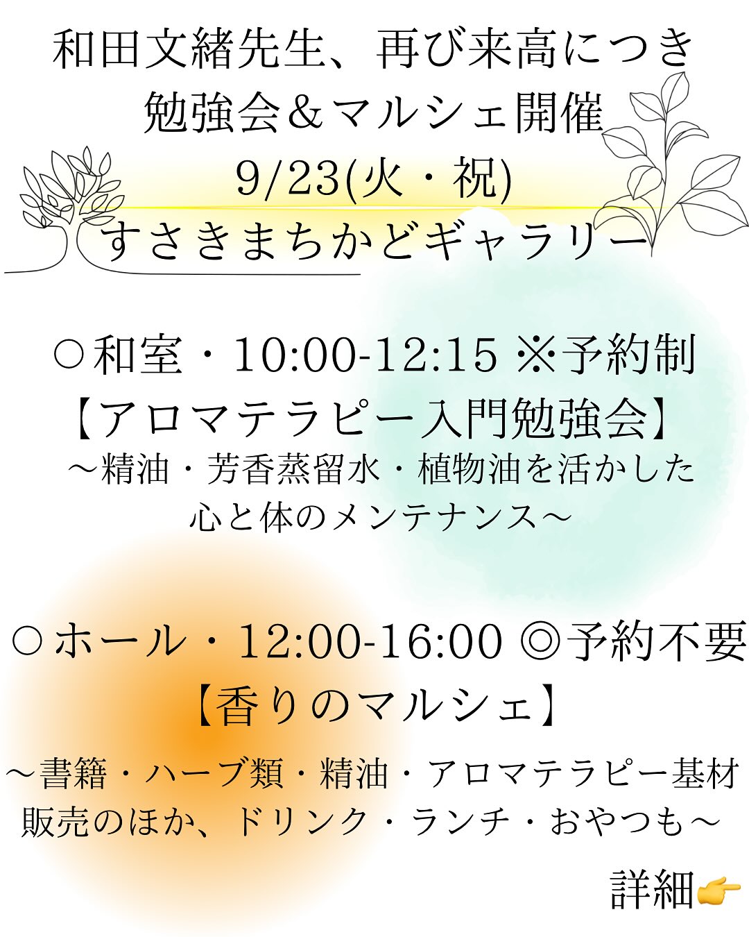 「アロマテラピーの教科書」(新星出版社)の著者である、アロマセラピスト・和田 文緒さんによる勉強会&マルシェが開催されます