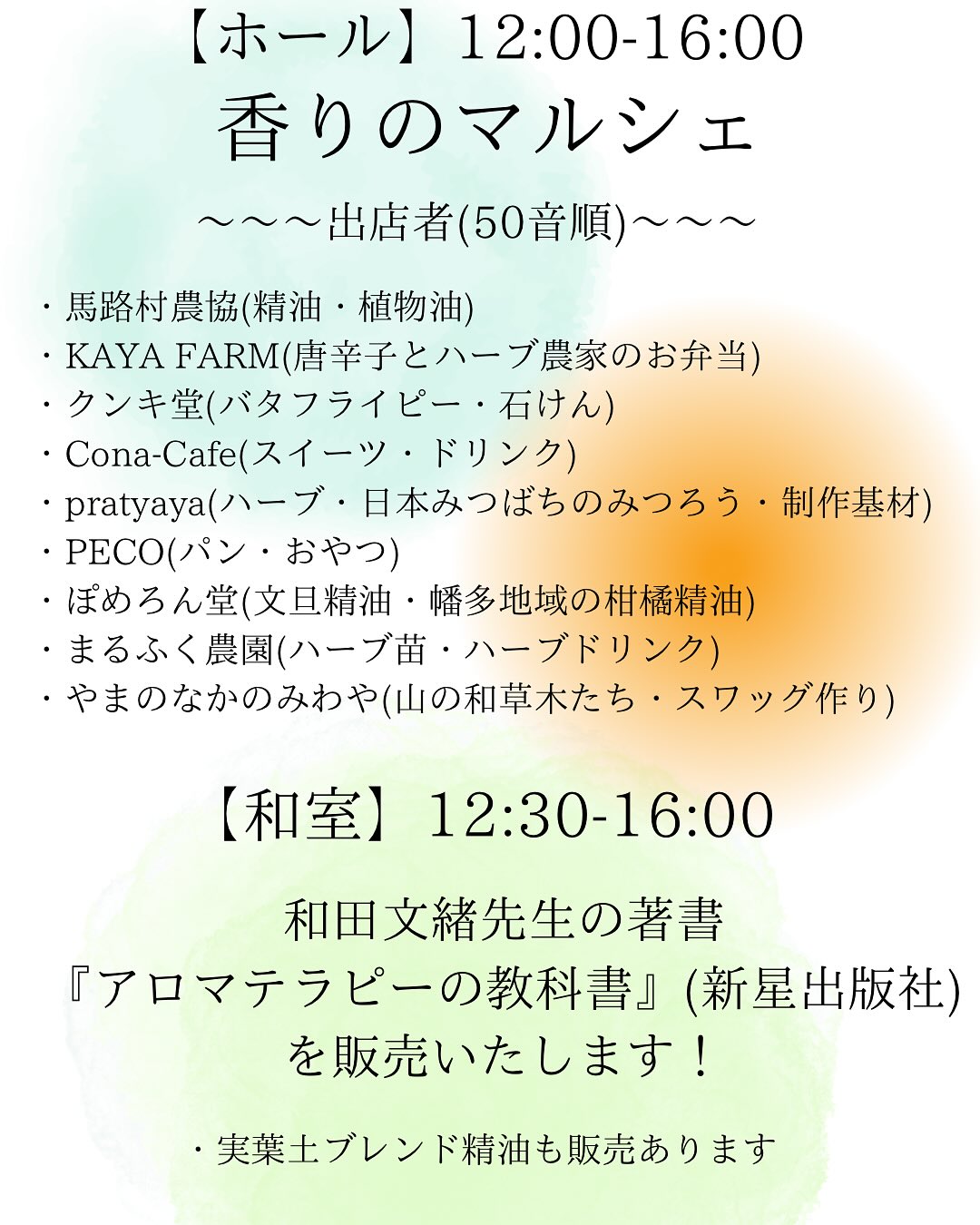 ハーブ類・精油・アロマテラピー基材や、ランチ、おやつのお店も出店されます